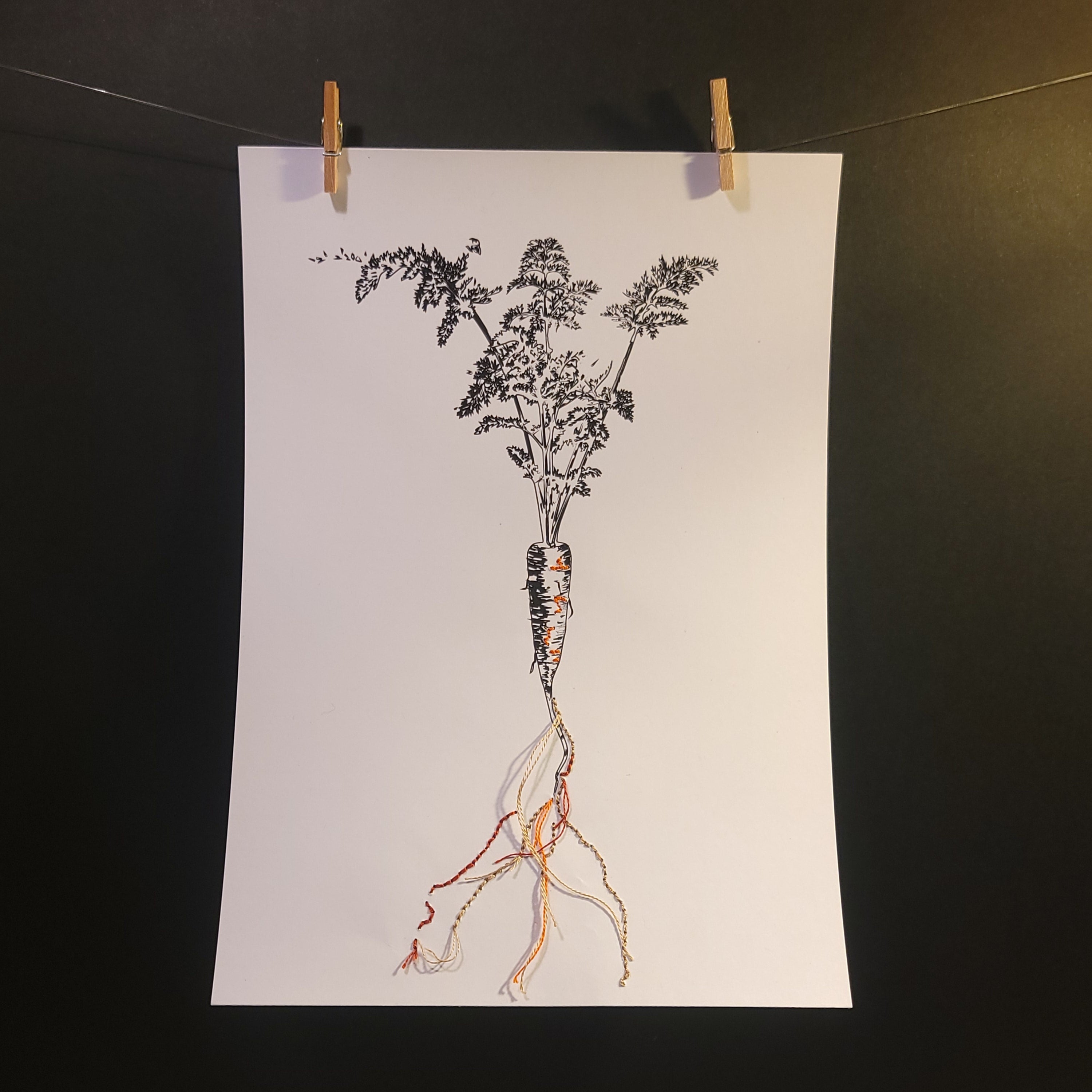 Découvrir l’œuvreAube poussiéreuse explore l'émergence d'une carotte, humble offrande de la terre. Le fil rebrodé se concentre sur les racines, dont les lignes fines et entremêlées rappellent les premières lueurs de l'aube. Cette œuvre est un hommage à la beauté brute et fondamentale du végétal.