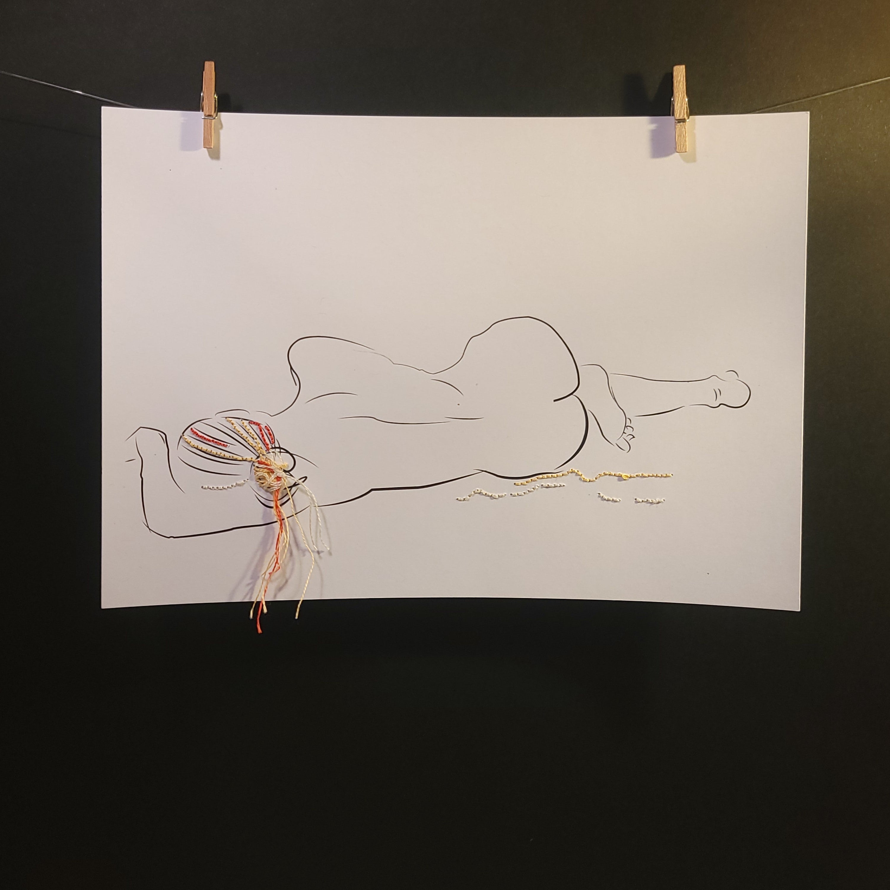 Découvrir l’œuvreLe Fil d'une Pose capture un instant de sérénité. Le corps féminin, dessiné avec une ligne épurée, s'offre au repos. L'accent est mis sur le chignon, brodé main, où la texture du fil recrée la densité et la complexité de la chevelure. Une ode à la douceur et à l'art du détail.