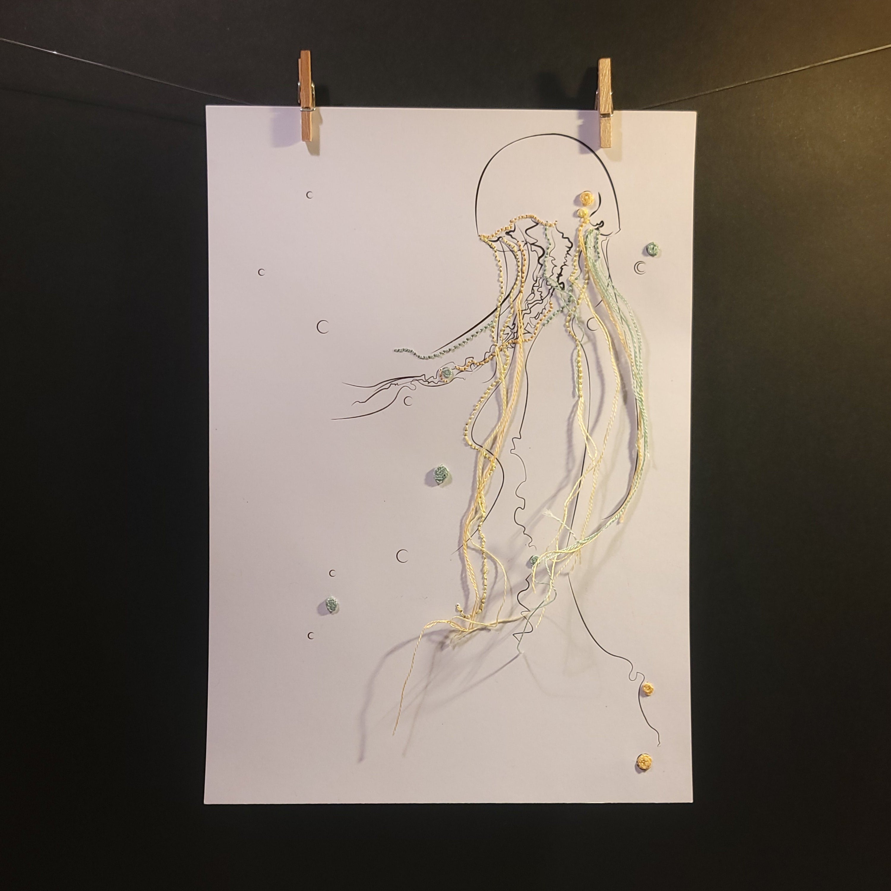 Découvrir l’œuvreFluorescence des profondeurs nous plonge dans le mystère des abysses. Le petit corps de la méduse émet une lumière iridescente rebrodée, son voile de tentacules se prolongeant en fils colorés. Cette œuvre capture l'éclat vivant et hypnotique de la créature dans l'obscurité marine.